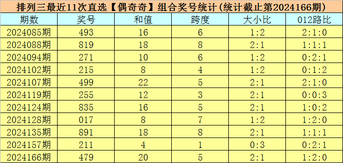 开奖回顾:排列三第2024166期开出奖号:479,类型为组六,和值为20,奇偶比为2:1,大小比为2:1,跨度为5。