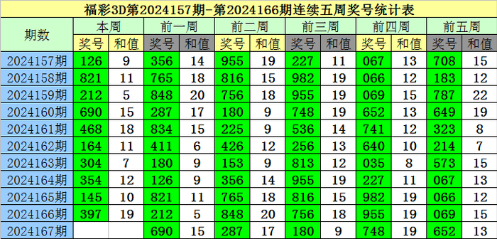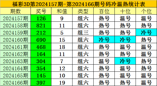 上期回顾:福彩3D第2024166期开奖奖号为:397,奖号类型为:组六,奖号冷温热态为:热号+热号+温号。