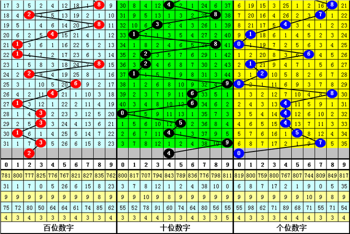 百位上期出现:热号3,该位连续十期以热号出现较多,以温号、冷号出现较少,本期该位温号有4个:2、6、7、8,看好温号转热,关注号码2。