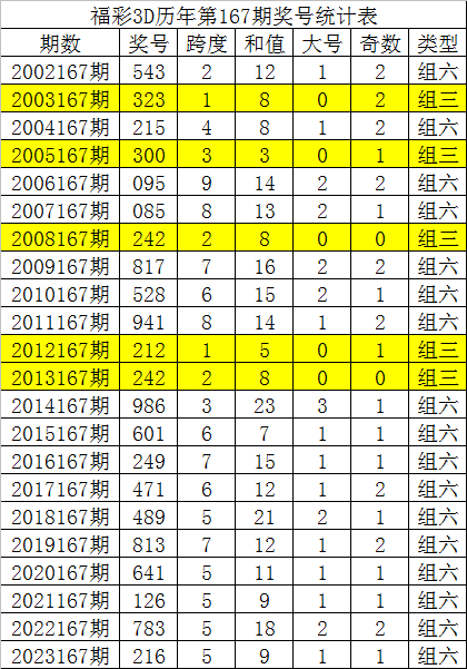 福彩3D历年第167期同期分别开出奖号:543、323、215、300、095、085、242、817、528、941、212、242、986、601、249、471、489、813、641、126、783、216,详细统计见下表: