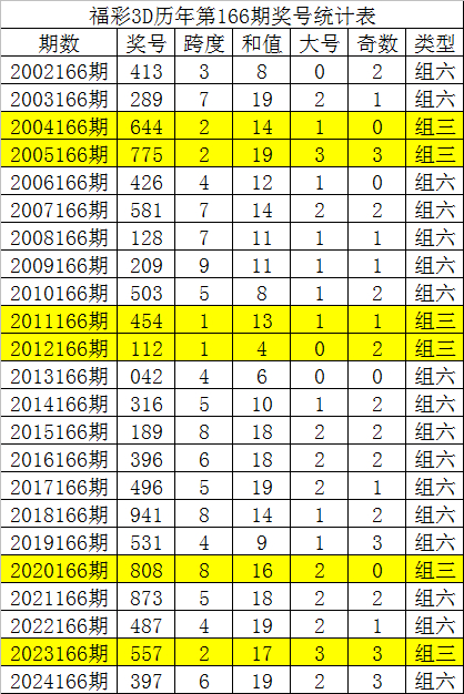 从以上统计可以看出,历年3D第167期开出了5次组三号码,开出了17次组六号码。组六号码出现概率大,本期预计开出组六号码。