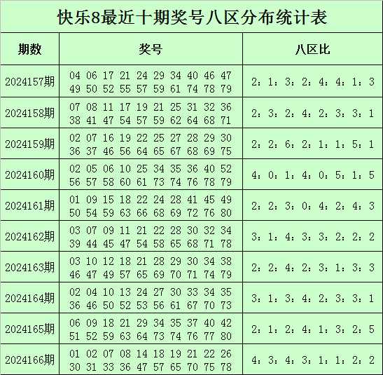 福彩快乐8第2024166期开奖回顾:01 02 07 08 14 18 19 21 22 26 30 31 33 36 47 57 65 70 75 78,其中奖号八区比为4:3:4:3:1:1:2:2。