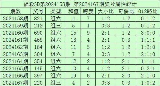 开奖回顾:福彩3D第2024167期开奖号:220,其中奖号和值:4,奇偶比0:3,大小比0:3。