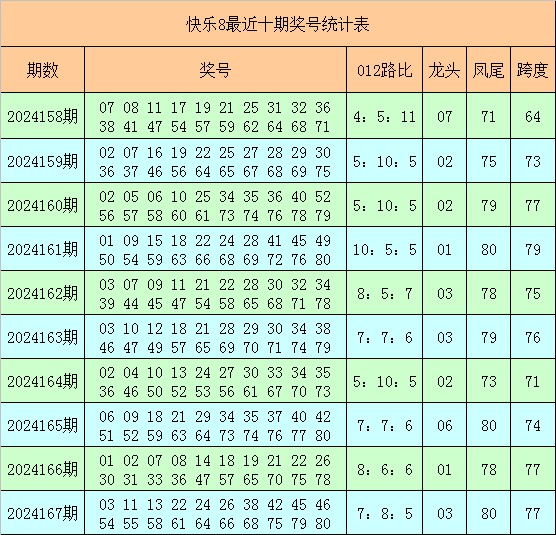 快乐8第2024167期奖号为:03 11 13 22 24 26 38 42 45 46 54 55 58 61 64 66 68 75 79 80,其中奖号012路比为7:8:5,0路号码(7个):03、24、42、45、54、66、75,1路号码(8个):13、22、46、55、58、61、64、79,2路号码(5个):11、26、38、68、80。