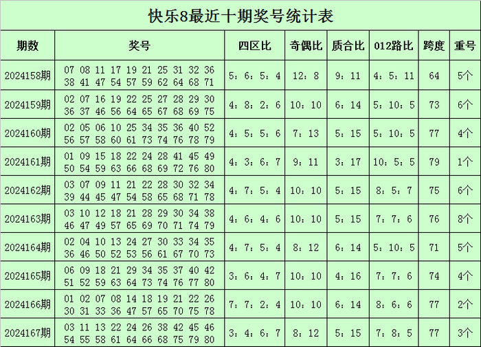 福彩快乐8第2024167期开奖回顾:03 11 13 22 24 26 38 42 45 46 54 55 58 61 64 66 68 75 79 80,其中奖号四区比为3:4:6:7,奇偶比为8:12,质合比为5:15,跨度为77,012路比为7:8:5,开出3个重号:22、26、75。