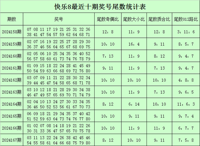 福彩快乐8第2024167期开奖回顾:03 11 13 22 24 26 38 42 45 46 54 55 58 61 64 66 68 75 79 80,其中奖号尾数奇偶比为8:12,尾数012路比为7:5:8,尾数大小比为10:10,尾数质合比为9:11。