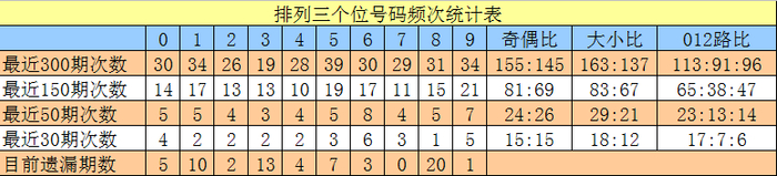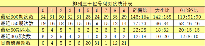 个位号码:前50期走势最活跃的号码为:6开出8个,9开出7个,0、1、5、8开出5个;走势最冷的号码为:3开出3个,2、4、7开出4个。个位号码大小比开出29:21,奇偶比开出24:26。本期个位排除两码:3、7,关注号码2、8、9,胆码参考2。