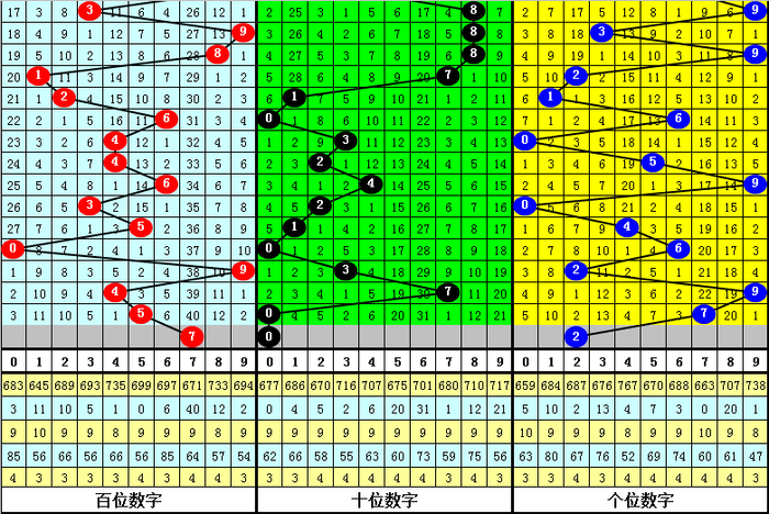 十位号码:前50期走势最活跃的号码为:0、2开出8个,3开出7个;走势最冷的号码为:5、6开出2个,9开出3个。十位号码012路比开出20:15:15,大小比开出18:32。本期十位排除两码:6、9,参考号码0、2、4,胆码关注0。