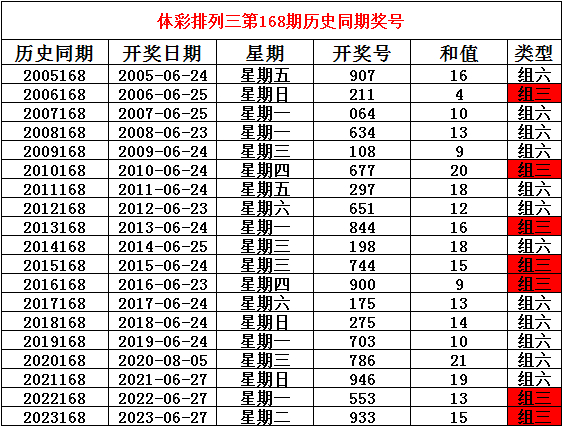 2024年6月26日排列三第168期开奖,历史同期分别开出奖号: