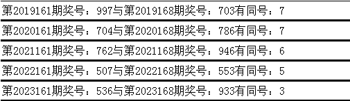 与前期历史同期奖号对比分析,在最近五年开奖中,第161期同期奖号与第168期同期奖号都出现了相同号码: