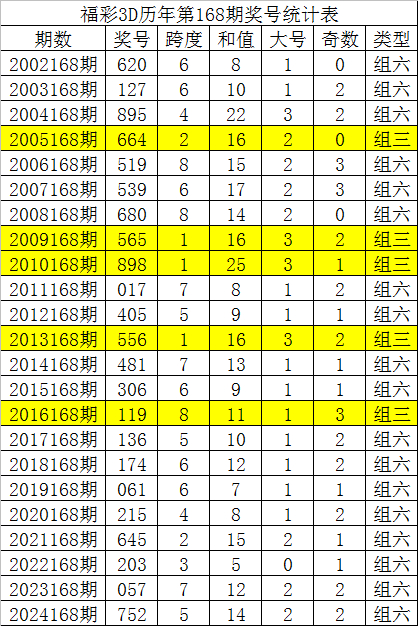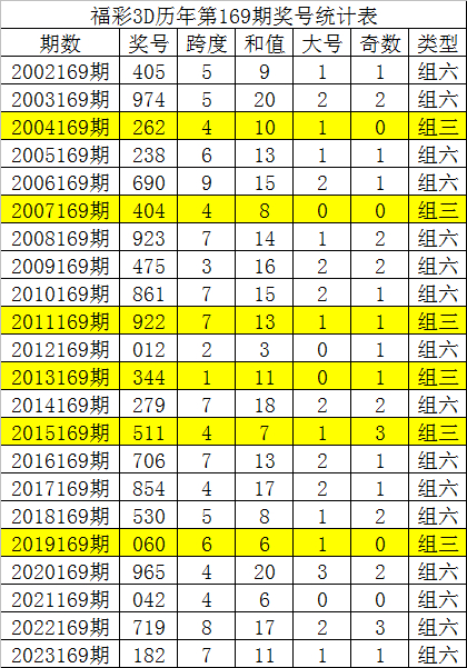 从以上统计可以看出,历年3D第169期开出了6次组三号码,开出了16次组六号码。组六号码出现概率大,本期预计开出组六号码。