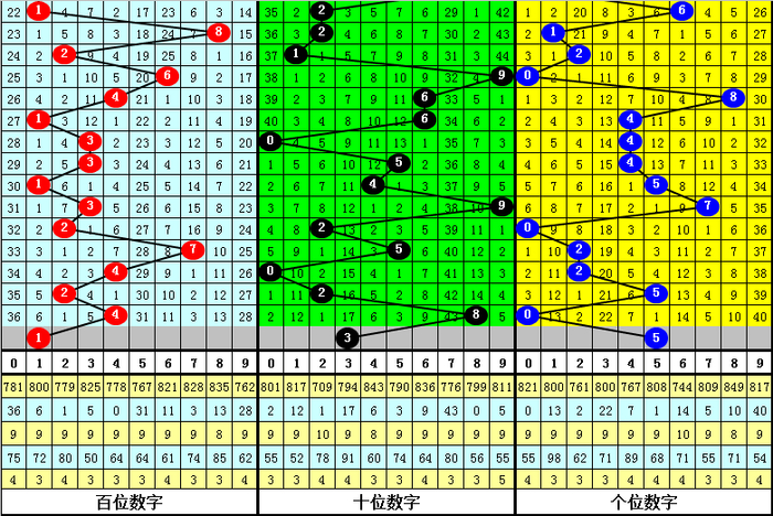 跨度分析:跨度最近10期012路比为2:3:5,2路跨度相对较热,近3期跨度分别遗漏3期、14期和14期,本期看好热码跨度出现,参考跨度4。