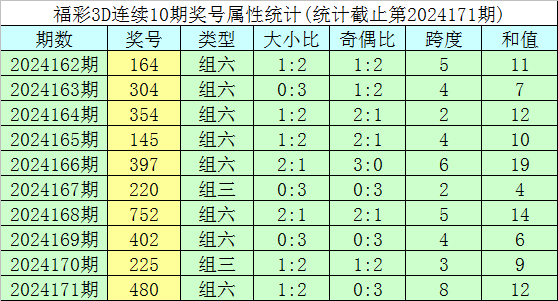 开奖回顾:福彩3D第2024171期奖号为480。奖号形态为组六,大小形态为小大小,奇偶形态为偶偶偶,和值为12,跨度为8。