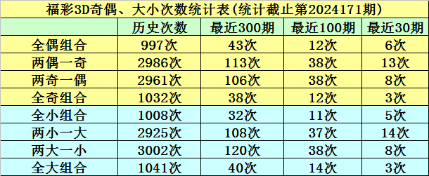 在前10期开奖中,全小组合出现3次,两小一大组合出现5次,两大一小组合出现2次,全大组合出现0次,本期预计开出两小一大组合。