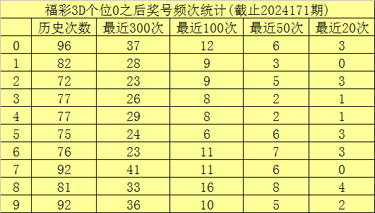 个位奖号0最近三期开出之后,其下期分别落号:6、8、2,号码出现在:高频区域、高频区域、低频区域,本期个位可以排除高频号码,杀5码:06789。