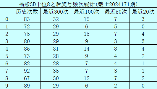 十位杀号:上期十位奖号为8,历史上十位奖号8共出现799期,前100次十位开出奖号8时,其下期0-9奖号频次分别为:奖号2、0开出15次,4开出14次,8开出12次,3、5开出9次,6、7开出7次,1、9开出6次。