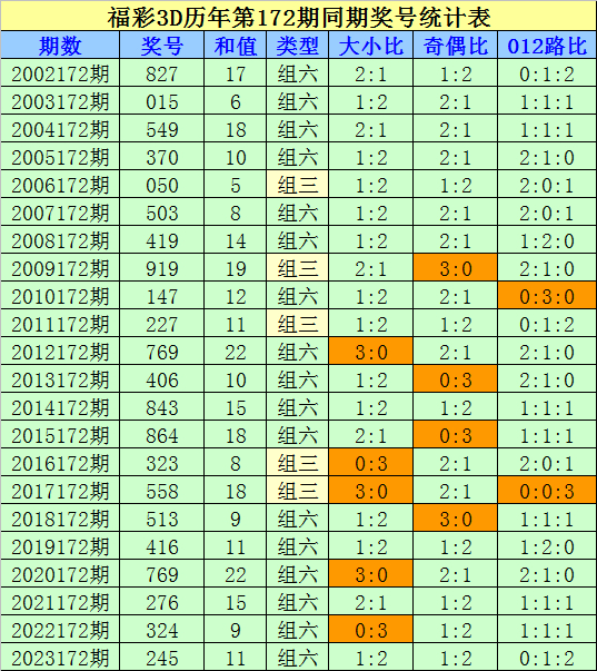 组选类型判断:在第172期历史同期开奖中,组六开出17次,组三开出5次,今年同期看好开出组六号码。