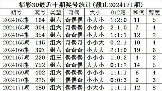 开奖回顾:福彩3D第2024171期奖号为480,奖号形态为:组六、小大小、1:1:1、偶偶偶。