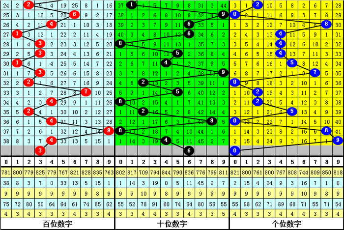 二、百位分析:上期开出号码4,前10次号码4出现之后下期分别开出号码:1658111129,其中号码大小比为4:6,基本相当;奇偶比为7:3,奇数号码热出;012路比为2:5:3,0路号码表现较冷。本期参考号码:3。