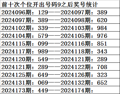 四、个位分析:上期开出号码9,前10次号码9出现之后下期同位号码为:9046139832,其中号码大小比为4:6,基本相当;奇偶比为5:5,相等;012路比为6:2:2,0路号码表现相对活跃。本期参考号码:0。