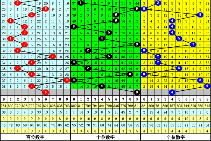 和值走势:最近10期和值走势为:(12)→(10)→(19)→(4)→(14)→(6)→(9)→(12)→(17)→(17),和值升降平次数比为6:3:1,上期和值走平重复落号,本期预计和值开始上升,看好和值19。