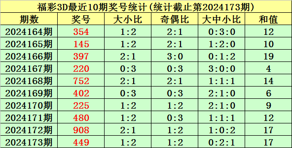 开奖回顾:福彩3D第2024173期奖号为:449。奖号类型为组三,和值为17,奇偶比为1:2,跨度为5,012路比为1:2:0,大小比为1:2。