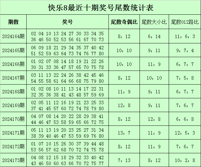 福彩快乐8第2024173期开奖回顾:04 08 12 15 18 29 32 33 40 42 43 46 50 60 63 66 70 72 75 77,其中奖号尾数012路比为10:2:8,尾数大小比为8:12,奇偶比为7:13。