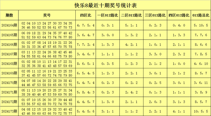 福彩快乐8第2024173期开奖回顾:04 08 12 15 18 29 32 33 40 42 43 46 50 60 63 66 70 72 75 77,其中奖号四区比为5:4:5:6,012路比为10:5:5,和值为855,跨度为73。