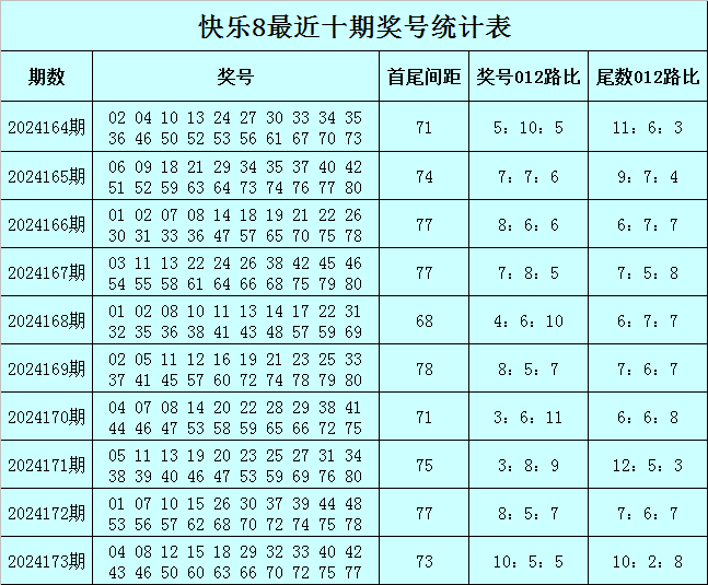 福彩快乐8第2024173期开出奖号:04 08 12 15 18 29 32 33 40 42 43 46 50 60 63 66 70 72 75 77,其中奖号012路比为10:5:5,尾数012路比为10:2:8。