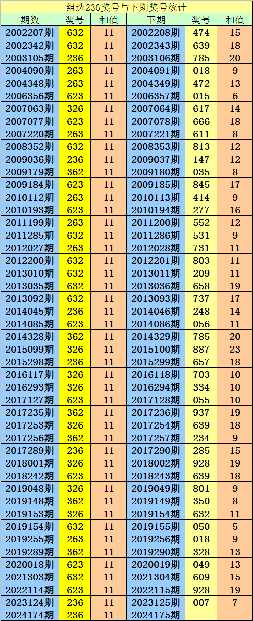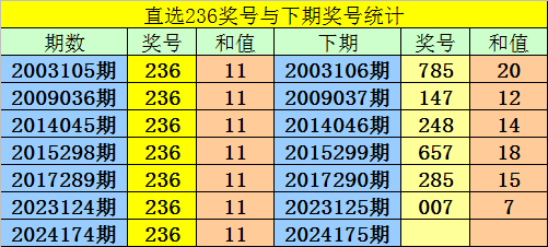 第2024174期3D奖号为:236,历史上该号码直选开出7次,下期号码分别为:785、147、248、657、285、007。