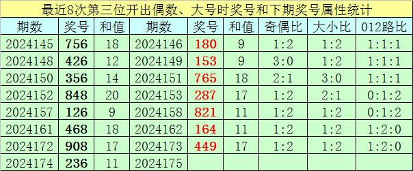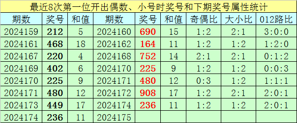 前7次第一位号码开出偶数、小 号时奖号分别为:212、468、220、402、225、480、449,其中奇偶总比例为3:18,有3期奇偶比与上期奇偶比相同;号码大小总比例为5:16,有3期奖号大小比与上期大小比相同;