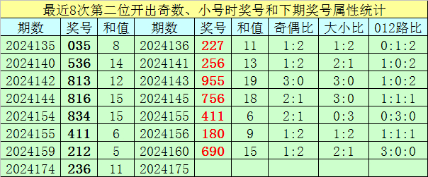 前7次第二位号码开出奇数、小 号时奖号分别为:035、536、813、816、834、411、212,其中奇偶总比例为11:10,有3期奇偶比与上期奇偶比相同;号码大小总比例为7:14,有3期奖号大小比与上期大小比相同;
