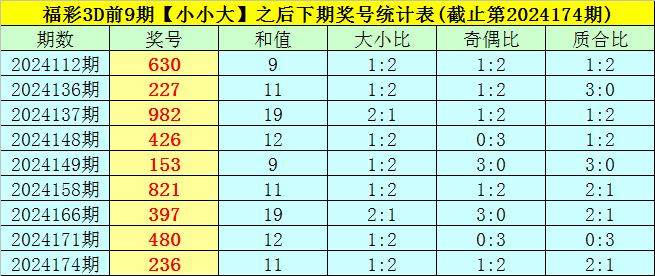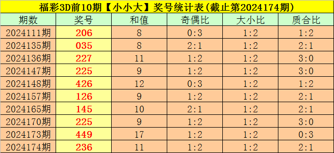 一、上期回顾:福彩3D第2024174期奖号为:236,奖号类型开出组六,大小比为1:2,奇偶比为1:2,和值为11,跨度为4,012路比为2:0:1。