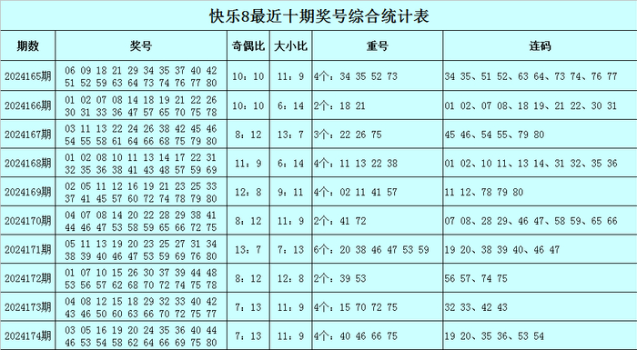 福彩快乐8第2024174期开出奖号:03 05 16 19 20 24 35 36 40 44 46 53 54 58 62 64 66 69 75 80,其中奖号奇偶比为7:13,大小比为11:9,包含4个重号40、46、66、75,包含连码19 20、35 36、53 54。