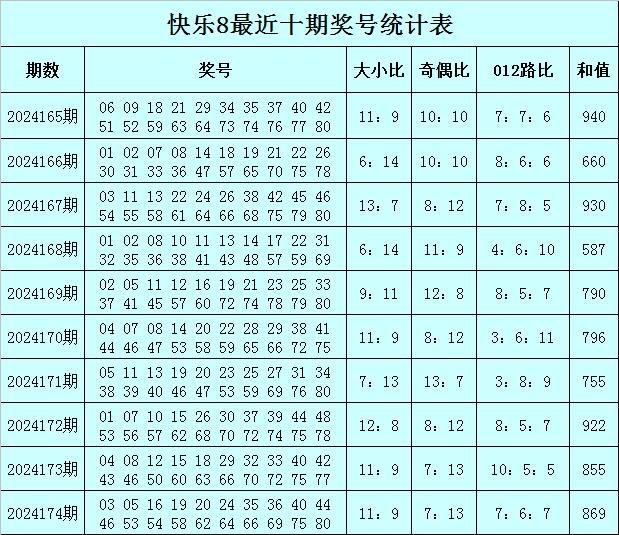 福彩快乐8第2024174期开奖回顾:03 05 16 19 20 24 35 36 40 44 46 53 54 58 62 64 66 69 75 80,其中奖号奇偶比开出7:13,大小比开出11:9,012路比开出7:6:7,和值为869,跨度为77。