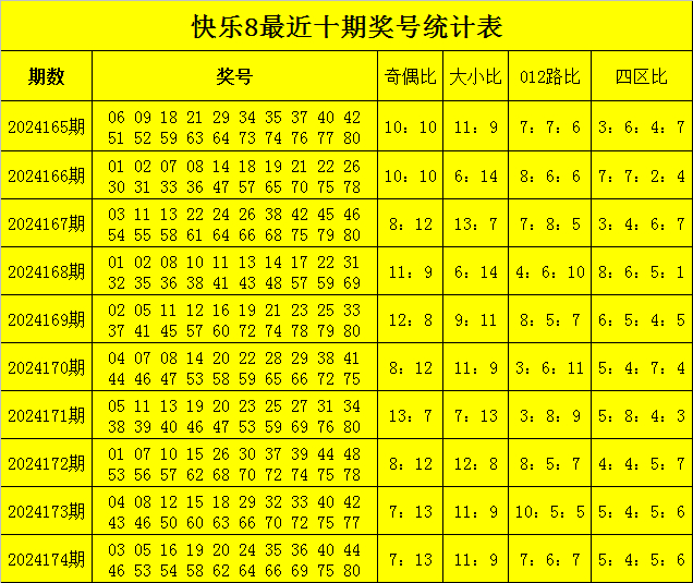 福彩快乐8第2024174期开奖回顾:03 05 16 19 20 24 35 36 40 44 46 53 54 58 62 64 66 69 75 80,其中奖号大小比为11:9,012路比为7:6:7,和值为869,跨度为77,奇偶比为7:13。