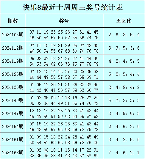 福彩快乐8第2024168期(上周三)开奖回顾:01 02 08 10 11 13 14 17 22 31 32 35 36 38 41 43 48 57 59 69,其中奖号五区比为7:4:6:2:1。