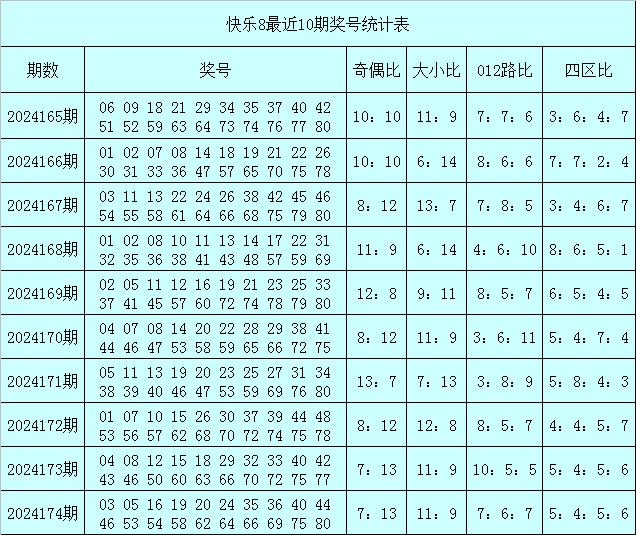 福彩快乐8第2024174期开出奖号:03 05 16 19 20 24 35 36 40 44 46 53 54 58 62 64 66 69 75 80,其中奖号奇偶比为7:13,大小比为11:9,012路比为7:6:7,四区比为5:4:5:6。
