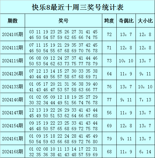 福彩快乐8第2024168期开奖回顾:01 02 08 10 11 13 14 17 22 31 32 35 36 38 41 43 48 57 59 69,其中奖号奇偶比为11:9,大小比为6:14,012路比为4:6:10,首尾间距为68。