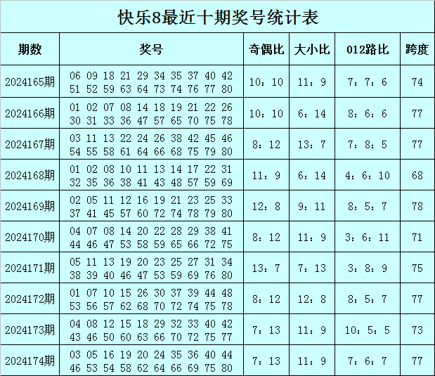 福彩快乐8第2024174期开奖回顾:03 05 16 19 20 24 35 36 40 44 46 53 54 58 62 64 66 69 75 80,其中奖号奇偶比开出7:13,大小比开出11:9,012路比开出7:6:7,和值为869,跨度为77。