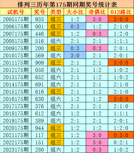 012路分析:历史上排列三第175期同期奖号中,012路奖号总个数比为30:15:12,012路奖号轮空期数比为2:9:10,今年第175期预计012路号码平衡出现,关注012路比1:1:1。