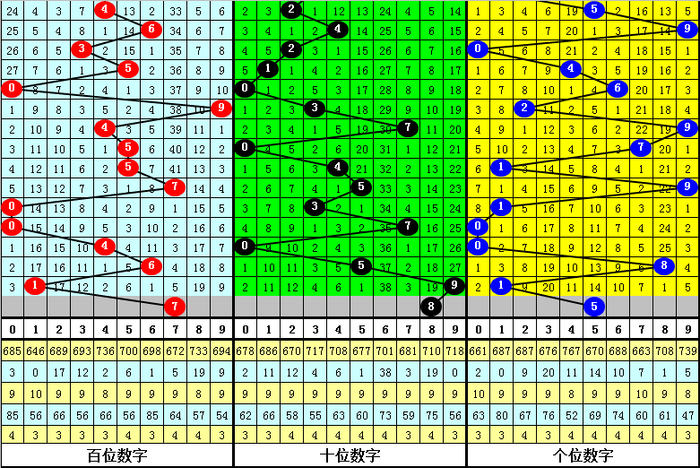 3、在以上0-9号码频次中,号码奇偶比为27:34,大小比为32:29,本期预计百位开出大号,参考号码7。