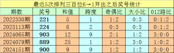 1、排列三最近两期百位号码分别开出6和1,历史上百位号码连续两期分别开出6和1的奖号出现了62期。前五期开出之后其下期奖号分别为:221、224、903、889、900;