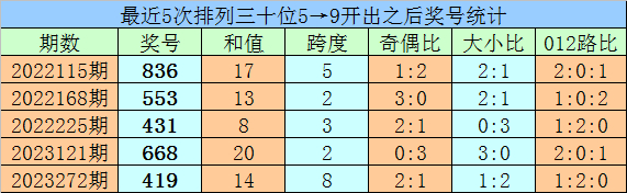 1、最近两期排列三十位号码开出号码分别为5和9,历史上十位号码连续两期同时出现号码5和9的奖号共开出73期。最近五次下期开出号码为:836、553、431、668、419;