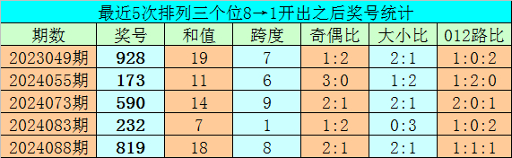 1、排列三前两期个位分别开出号码8和1,历史上个位号码连续两期分别出现8和1时,共有65次。在最近5次出现时,其下期分别出现号码:928、173、590、232、819;
