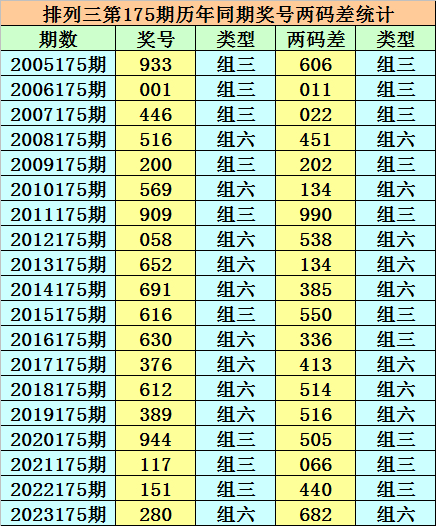在排列三第175期历史同期开奖中,各号码两码差分别为:066、011、022、145、022、134、099、358、134、358、055、336、134、145、156、055、066、044、268;