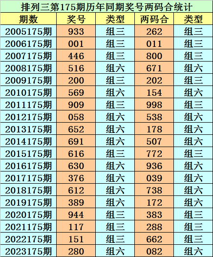 排列三从2004年开奖至今已开出6946期奖号了,其中第175期历史同期奖号出现19次,历年第175期分别开出号码:933、001、446、516、200、569、909、058、652、691、616、630、376、612、389、944、117、151、280。