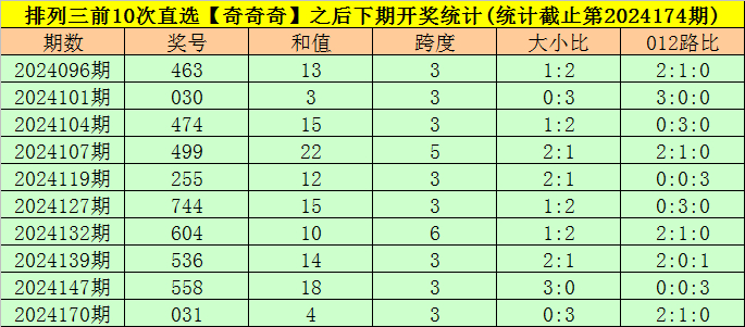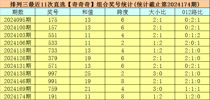 开奖回顾:排列三第2024174期开出奖号:191,类型为组三,和值为11,奇偶比为3:0,大小比为1:2,跨度为8。