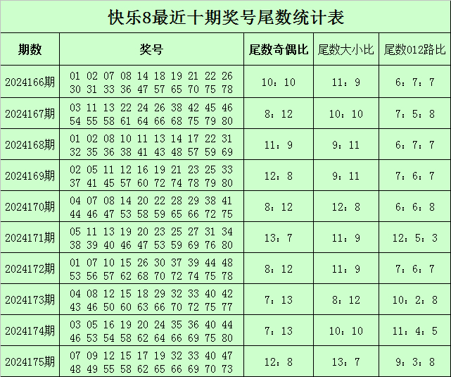 福彩快乐8第2024175期开奖回顾:07 09 12 15 17 19 32 33 40 47 48 49 55 58 62 65 66 69 70 73,其中奖号尾数012路比为9:3:8,尾数大小比为13:7,奇偶比为12:8。