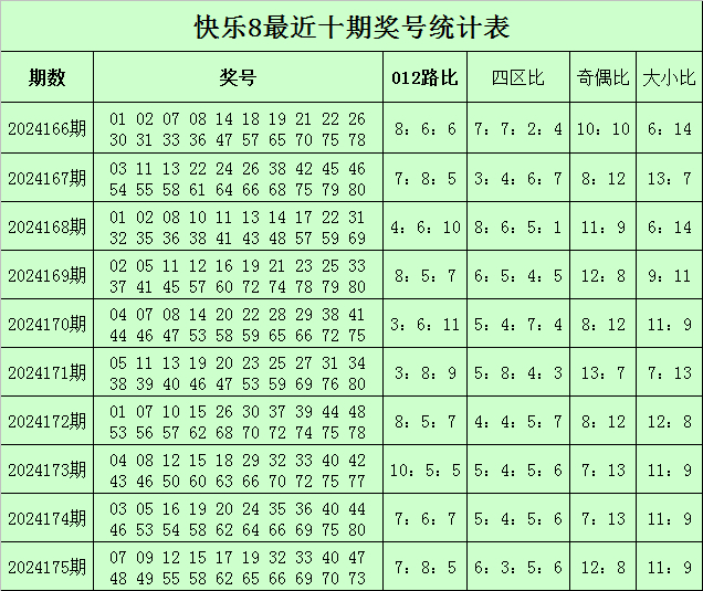 福彩快乐8第2024175期开奖回顾:07 09 12 15 17 19 32 33 40 47 48 49 55 58 62 65 66 69 70 73,其中奖号012路比为7:8:5,四区比为6:3:5:6,奇偶比为12:8,大小比为11:9。